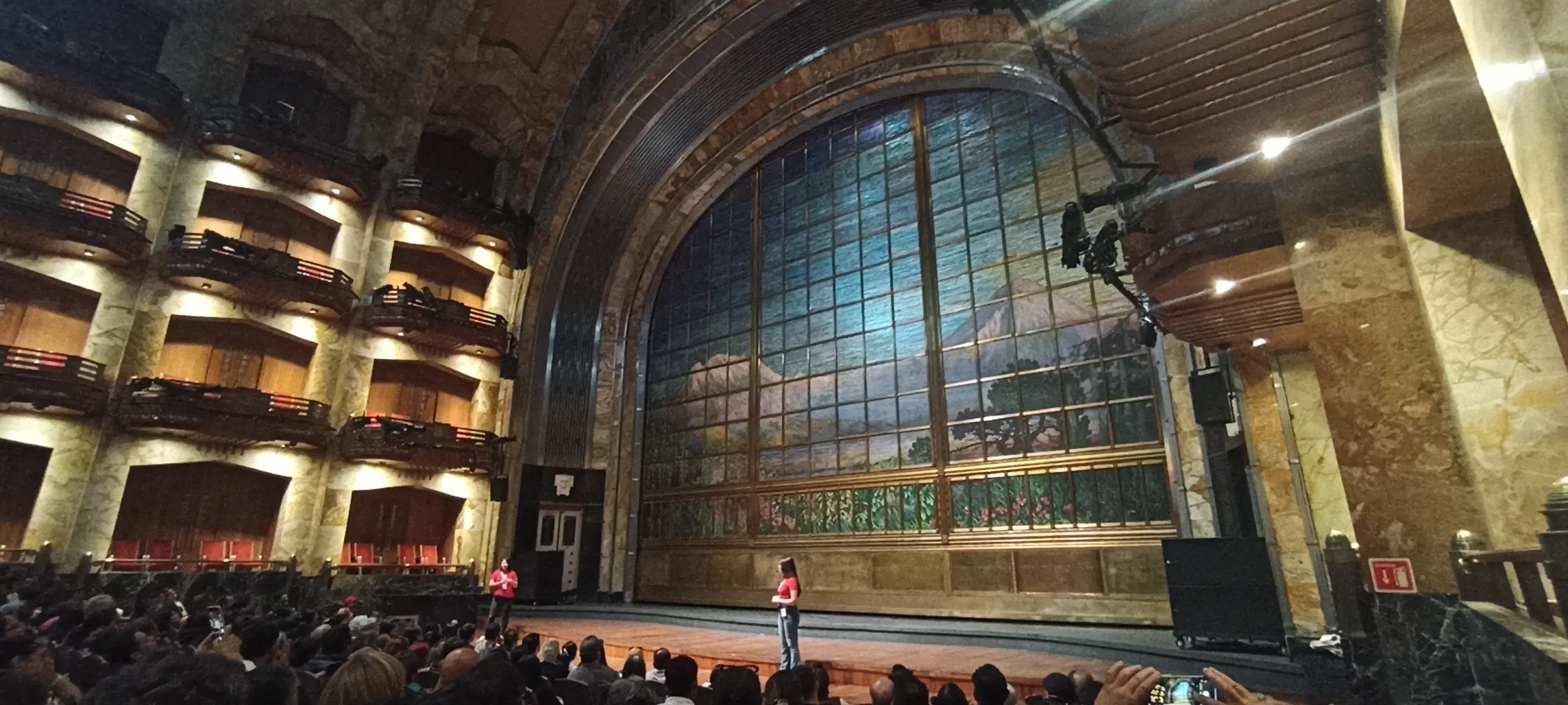 El viaje culmina en el santuario máximo: la sala principal. Si tienes la suerte de entrar durante una función, entenderás por qué este lugar es sagrado. La sala es una joya de acústica y diseño, presidida por el legendario telón de cristal de Tiffany. Compuesto por casi un millón de cristales opalescentes, este “muro de luz” recrea a los volcanes Popocatépetl e Iztaccíhuatl, vigilando el escenario como si la geografía misma de México se hubiera detenido a observar el arte.