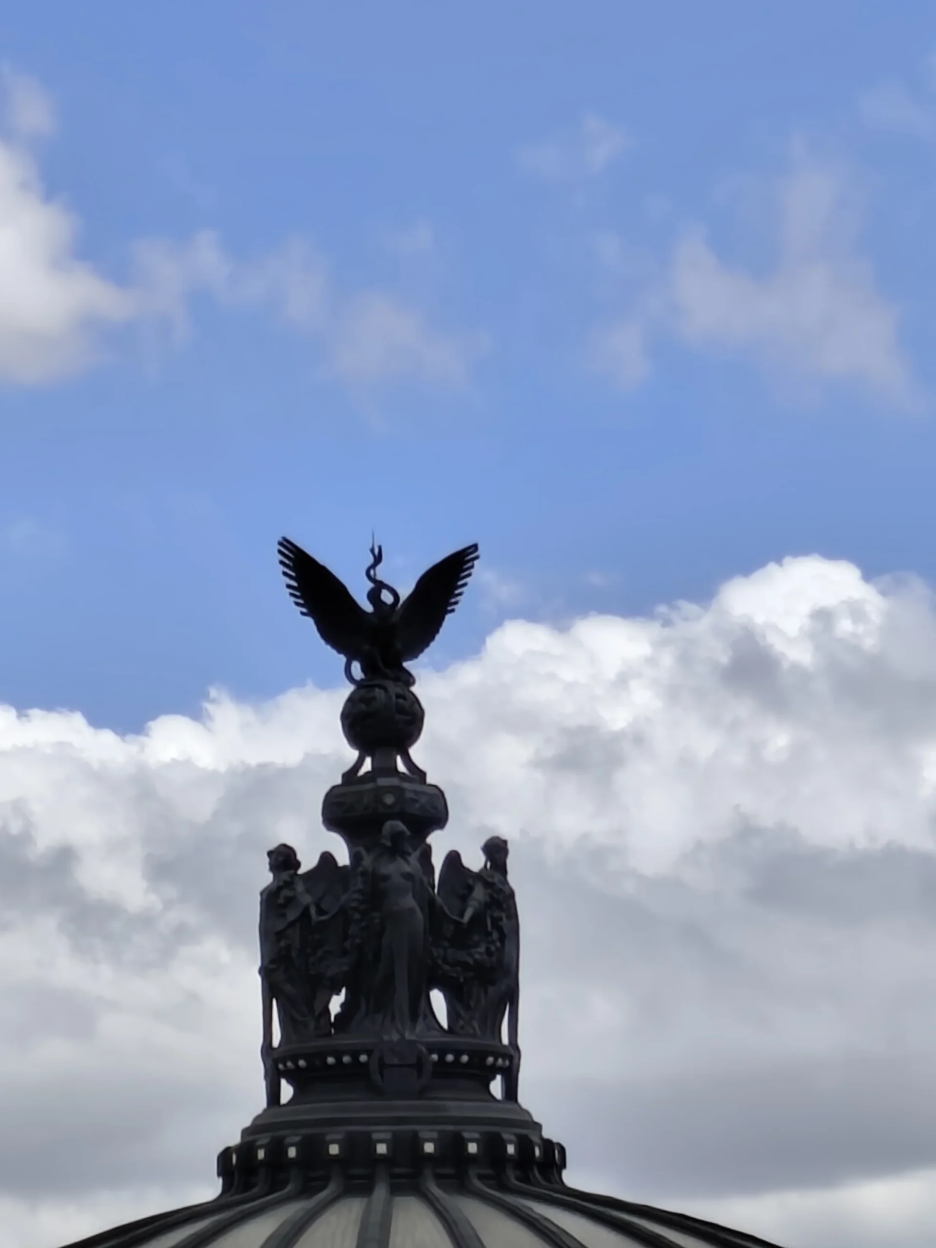 Esa suavidad del mármol, que parece rendirse ante la mirada, sirve de base para una transición visual ascendente: conforme la vista recorre las cornisas y se despega de la blancura impoluta de la fachada, el edificio abandona su sobriedad pétrea para abrazar la luz en su punto más alto, donde el detalle de la piedra cede el protagonismo a una explosión de color que desafía la gravedad. La cúpula, recubierta de azulejos que transitan del amarillo vibrante al naranja encendido, simula un sol eterno sobre la avenida Juárez, funcionando como el altar perfecto para que en su cúspide emerja, majestuosa, el Águila Republicana. Diseñada por el húngaro Géza Maróti, esta escultura monumental de bronce dota al palacio de una autoridad casi mística; con las alas desplegadas, el guardián parece estar en un perpetuo estado de vigilia, a punto de emprender el vuelo sobre la Alameda para vigilar el destino de la ciudad, descansando sobre una semiesfera custodiada por cuatro figuras femeninas que personifican las artes fundamentales: el Drama, la Lírica, la Comedia y la Tragedia.