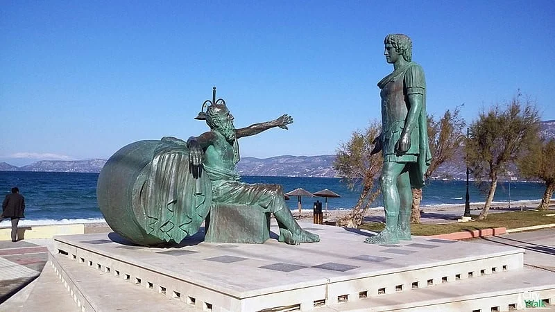 El relato más famoso de Diógenes tiene que ser cuando le conoció Alejandro Magno, rey de Macedonia, que ejemplifica su desacato de cualquier autoridad y desprecio de la riqueza. Existen varias versiones de la historia, pero la de Laercio (cuyas historias hemos favorecido en esta nota) nos relata que un día se hallaba Diógenes tomando el sol en el Craneion (suburbio de Atenas) cuando se le acercó Alejandro Magno y le dijo: “Yo soy Alejandro, aquel gran Rey” y Diógenes replicó “Yo soy Diógenes, el can” (Laercio, 1792); seguido a esto, Alejandro le dijo “Pídeme lo que quieras”, a esto replicó el cínico “Pues no me hagas sombra” (Laercio, 1792). Laercio asegura que Alejandro quedó tan maravillado por la personalidad de Diógenes que dijo “si no fuera Alejandro, querría ser Diógenes” (1792)