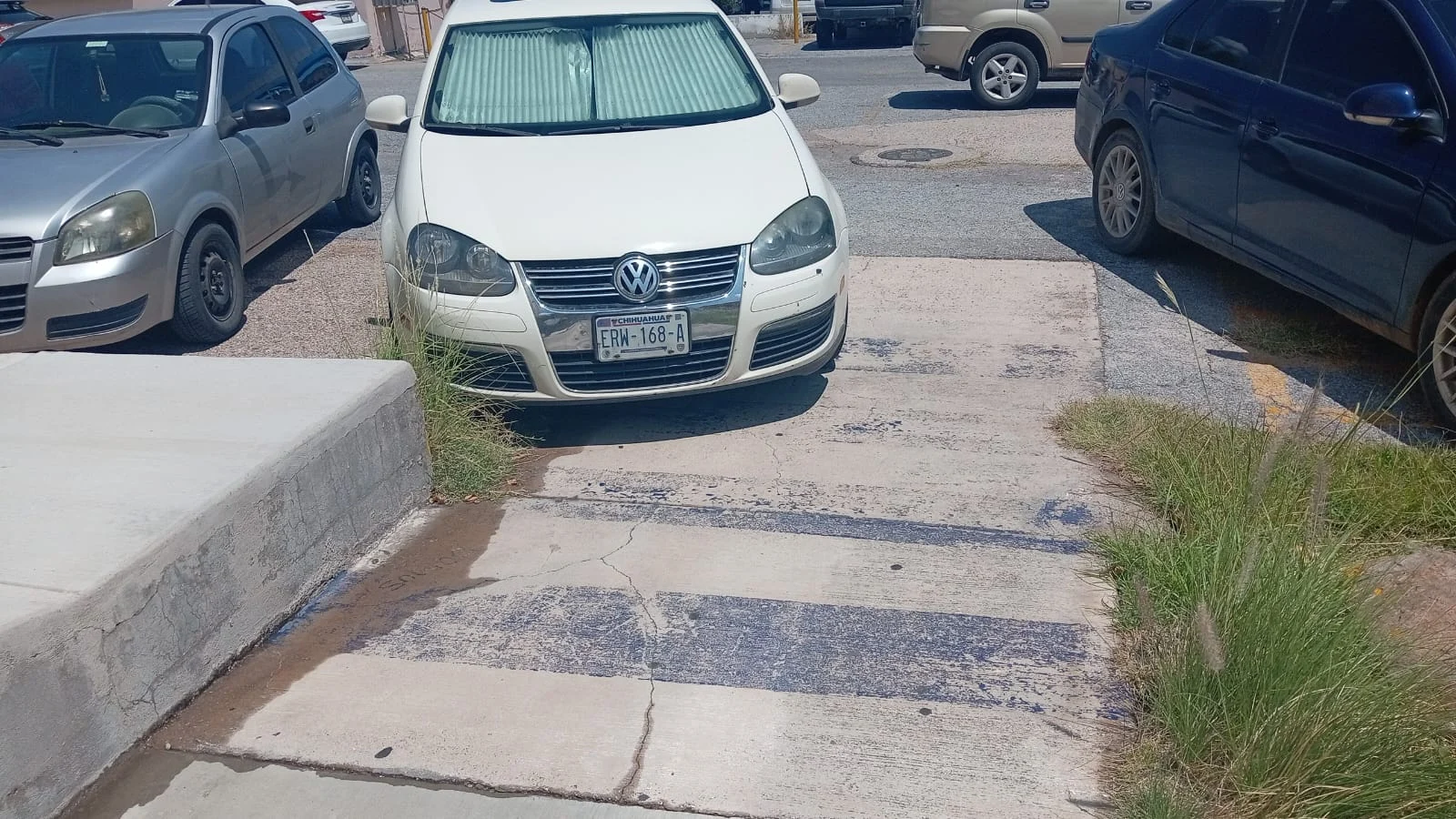 Las imágenes capturadas muestran vehículos particulares estacionados directamente sobre rampas azules, que están pintadas específicamente para señalar su uso exclusivo para personas con discapacidad. En ambos casos, el paso está completamente obstruido, y esto imposibilita el cruce de cualquier persona en silla de ruedas o el estacionamiento para un vehículo que tenga permitido el estacionamiento ahí.