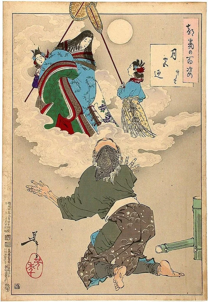 Cuenta la leyenda que un pobre y anciano cortador de bambú se dedicaba diligentemente a su trabajo, cuando de pronto, en medio de un tallo de bambú, surgió repentinamente un resplandor incandescente. Asombrado ante tal fenómeno, el viejo cortador de bambú se acercó a ese tallo luminoso en el que, para la mayor de sus sorpresas, encontró una pequeña bebé que no medía más de 5 cm. Tomó cuidadosamente a este pequeño ser resplandeciente entre sus manos, pensando que era una bendición de los dioses. Al instante, comienzan a brotar oro y piedras preciosas del mismo tallo en el que se encontraba la pequeña. Decidido, se dispone a cuidar de ella como si se tratara de una encomienda divina.