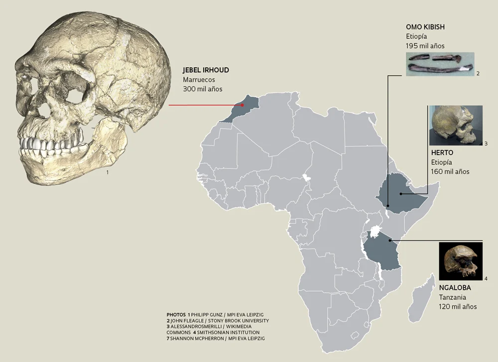 Del descubrimiento de la mandíbula de Ledi – Geraru, le siguen los restos encontrados en Jebel Irhoud, Marruecos, con una antigüedad datada entre 300 000 y 350 000 años antes de nuestra era.