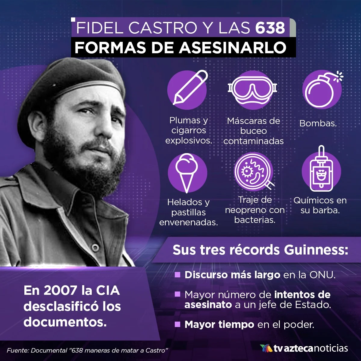 Los documentos desclasificados, los testimonios de exagentes y la propaganda cubana coinciden en un punto: hubo múltiples intentos de asesinar a Castro. Algunos resultan tan sofisticados como absurdos: puros explosivos, trajes de buzo impregnados de toxinas, caracoles bomba, venenos ocultos en bebidas y hasta planes con ayuda de la mafia estadounidense. Aunque las cifras varían, se ha llegado a hablar de más de 600 complots, lo que convirtió a Castro en el líder más perseguido de la Guerra Fría.